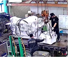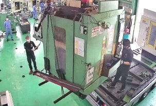 お客様の機械が会社に持ち込まれます。慎重にクレーン操作しながら、社内工場の作業エリアまで移動させます。
