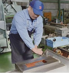 [ポイント]機械がスムーズに動くために「きさげ加工」によりミクロン単位(1000分の1mm)の調整をします。数十年の経験を積んだ職人の行う、大切な作業です。